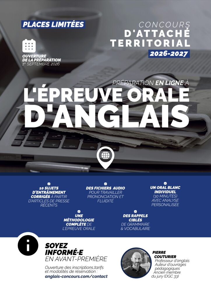 Le contenu détaillé de la préparation en ligne à l’épreuve orale d’anglais au concours d’attaché territoriale sera disponible début 2026, avec un nombre de places limitée.